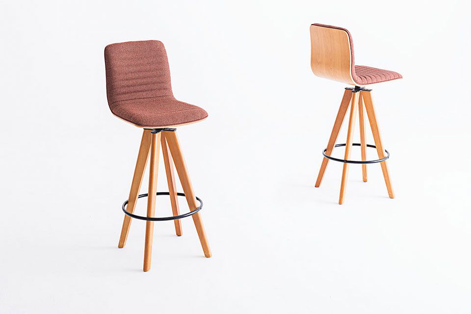 Banqueta Elisa lamina natural e estofada, base madeira giratória